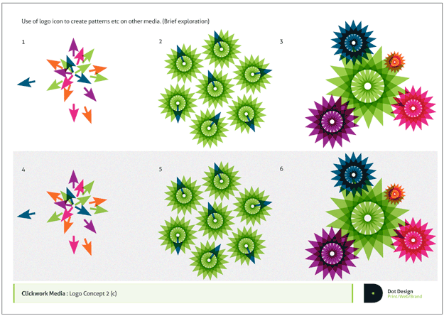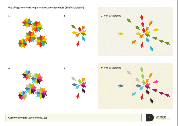 Based around the idea of the cursor becoming a repeated circular pattern to form a cog, playing on the name ‘Clickwork’ / Clockwork’
