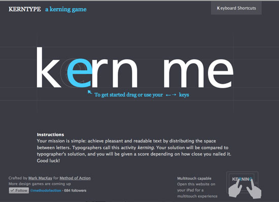 I can’t imagine there are many kerning based games knocking about the internet, so it was great to stumble upon this one via Twitter. ‘Kern Me’ is a Html 5 built website that challenges designers and a like to kern various words and be scored on the results.