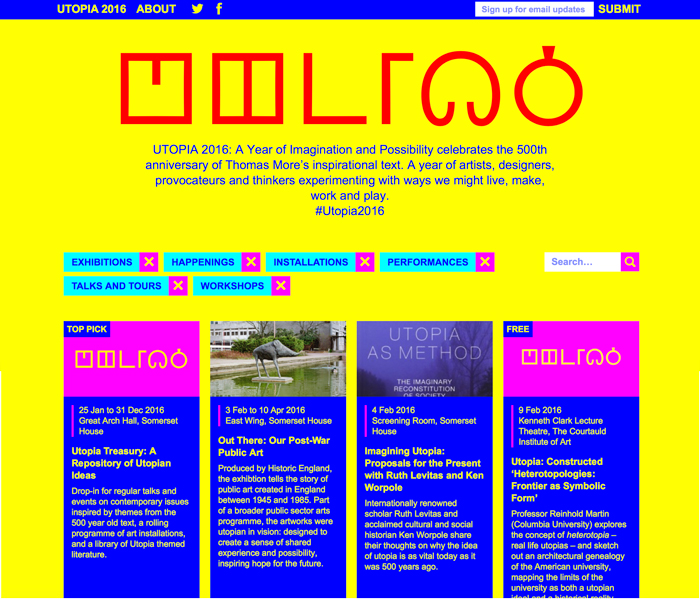 In terms of design this new identity design for Somerset House’s ‘Utopia 2016’ is quite bold move. It features rave smileys, magenta, yellow clash together and a new alien type alphabet is created. Utopia 2016 is “a Year of Imagination and Possibility celebrates the 500th anniversary of Thomas More’s inspirational text. A year of artists, designers, provocateurs and thinkers experimenting with ways we might live, make, work and play.”